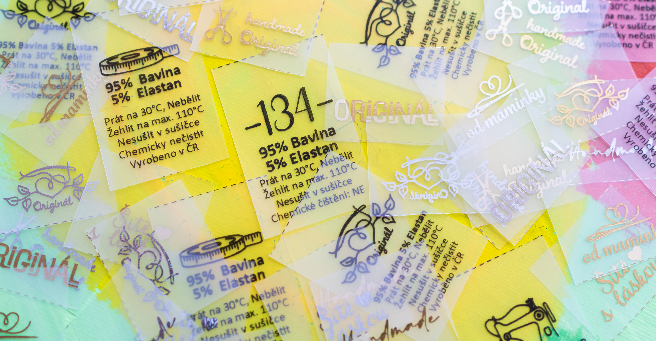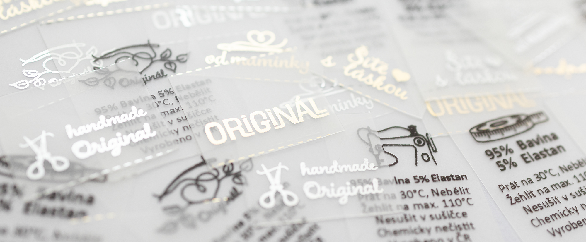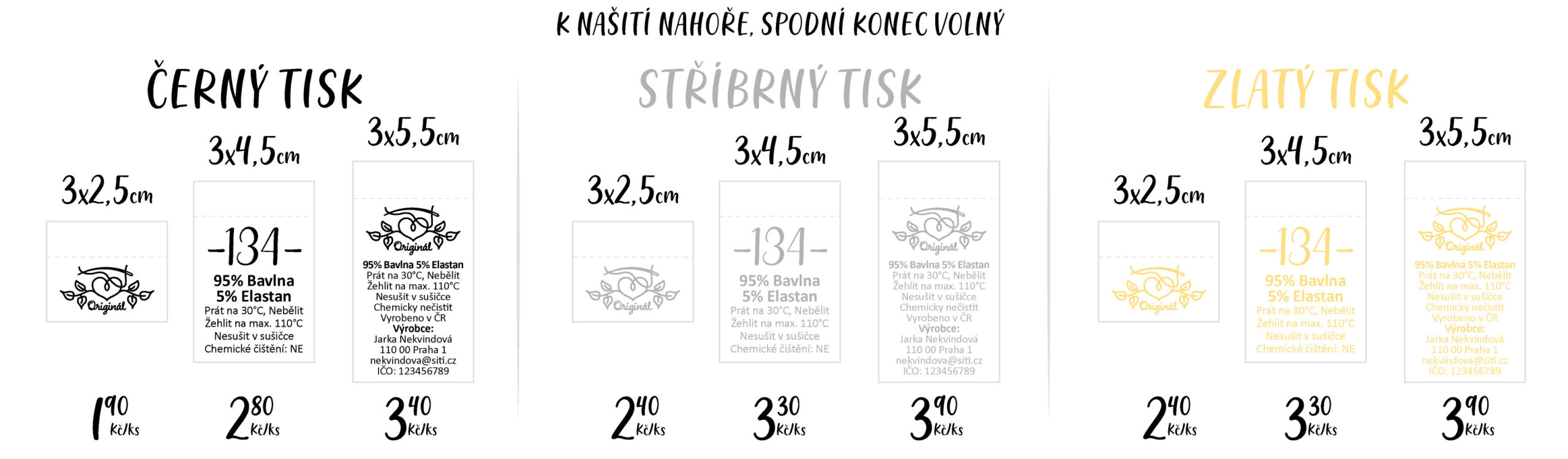 TPU štítky jsou průhledné, lehce matné s jemným povrchem, který je velmi příjemný na dotek. Konce se netřepí, zašívají se do švu bez přehybu. Štítky nabízíme v šíři 3cm, potiskujeme je černou, stříbrnou, nebo zlatou barvou. Doporučené rozměry štítků: 3×2,5cm, 3×4,5cm a 3×5,5cm. Po několika cyklech praní mohou TPU štítky lehce tmavnout, což není na závadu, je to přirozený jev.
