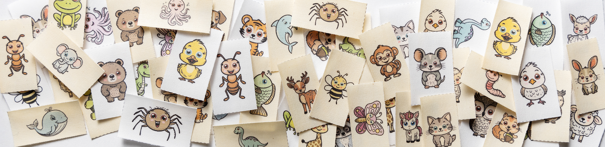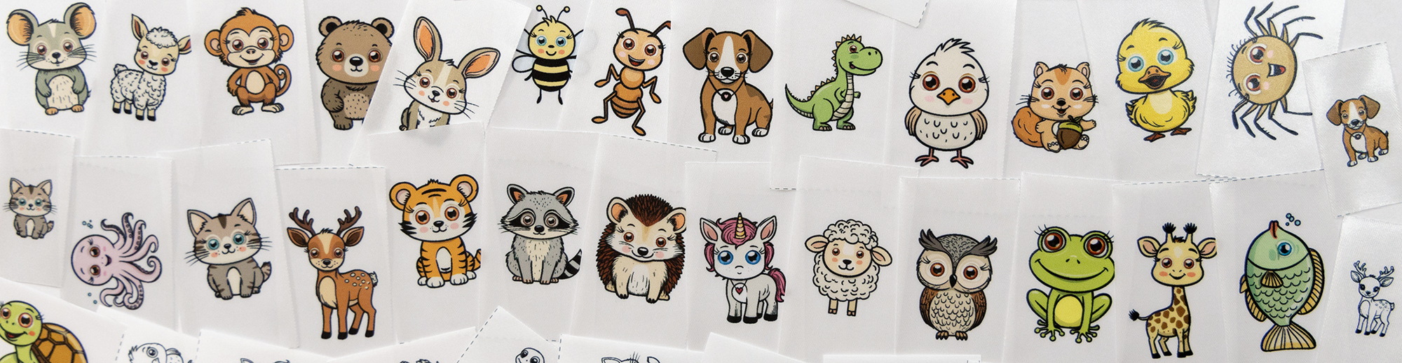 Zvířátka na bavlně. Zvířátka tiskneme na štítky z přírodní, nebo bílé bavlny plátnovky. Doporučujeme šíři 2cm a 2,5cm.